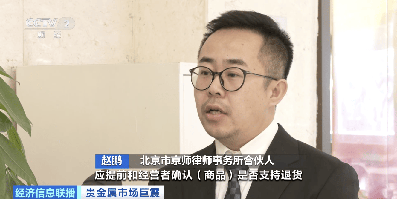 北京市京师律师事务所合伙人 赵鹏:建议消费者在购买金饰金条时,应该和经营者确认商品是否可以退货、退货是否需要理由、退货的条件和期限,平台可以在消费者购买前增加提示弹窗,以尽到提示义务。